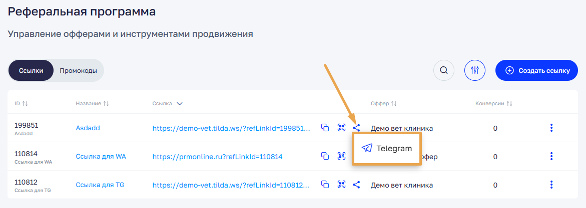 Если функция Обмен ссылками включена, в кабинете партнёра в разделе «Реферальная программа» у всех реферальных ссылок и промокодов появляется кнопка «Поделиться».
