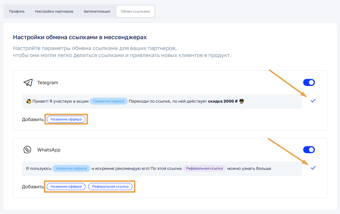 Функция Обмен ссылками позволяет добавить к реферальным ссылкам и промокодам кнопки быстрой отправки в мессенджеры. Это помогает партнёрам в один клик делиться реферальными инструментами и привлекать новых лидов.